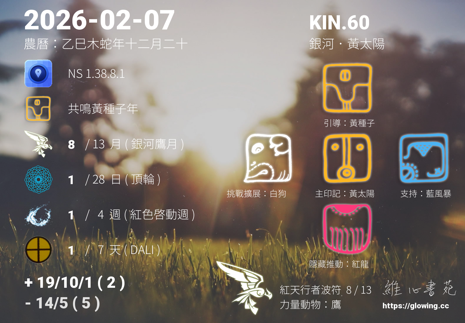 我們可以稱 KIN 60 為 【銀河黃太陽】 、 【銀河的黃太陽】 、 【紅天行者波符 之 銀河黃太陽】 也可以是 【銀河黃太陽.紅天行者波符】 ,你比較喜歡哪一個稱號呢?