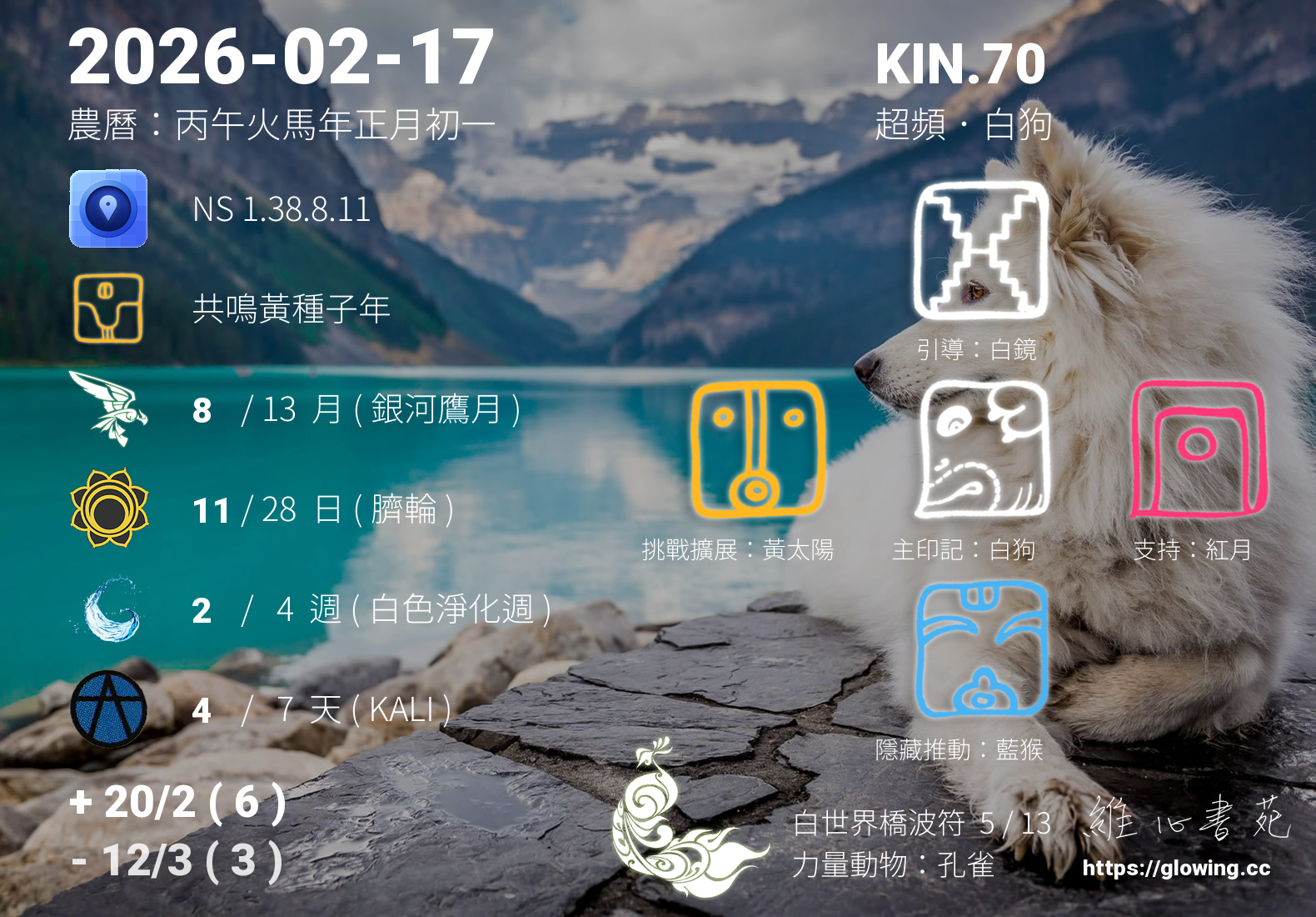 白狗的引導依據KIN的調性不同會有五種可能性,KIN.70的引導圖騰是白鏡 , 白鏡引導著我們認清自我,為我們的未來留下紀錄,將我們每一個思緒紀錄在天體運行中,在我們回歸的那個當下,迴向各所有的存在與眾生,為這個世界留下美麗色彩。
