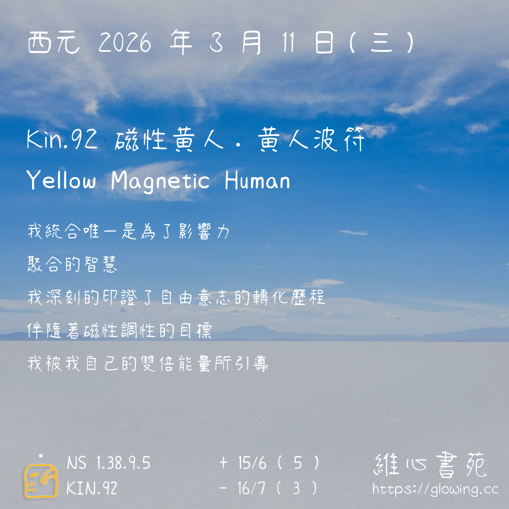 我們可以稱 KIN 92 為 【磁性黃人】 、 【磁性的黃人】 、 【黃人波符 之 磁性黃人】 也可以是 【磁性黃人.黃人波符】 ,你比較喜歡哪一個稱號呢?