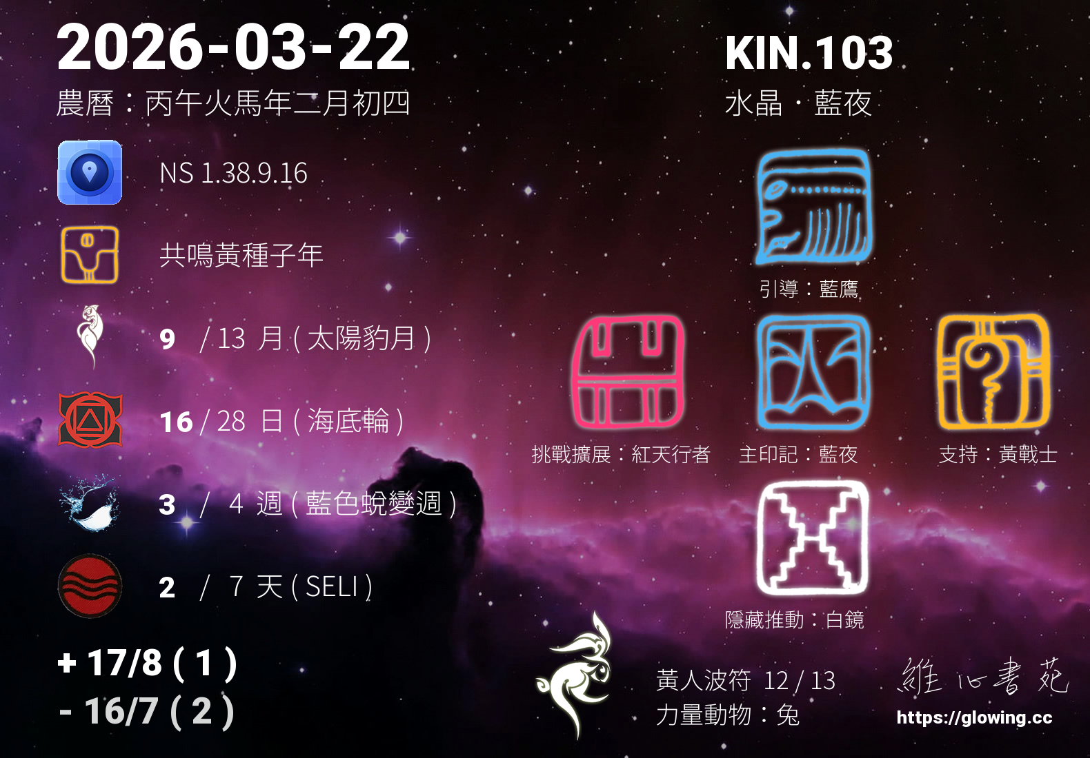 藍夜的引導依據KIN的調性不同會有五種可能性,KIN.103的引導圖騰是藍鷹 , 透過藍鷹的引導,我們看透事物的本質,看到能量的型態,看到真實的架構,看到無與倫比的美麗,沒有什麼比真實的純粹更能讓我們感動與舒適,所有的一切在藍鷹的引導下,如實呈現。