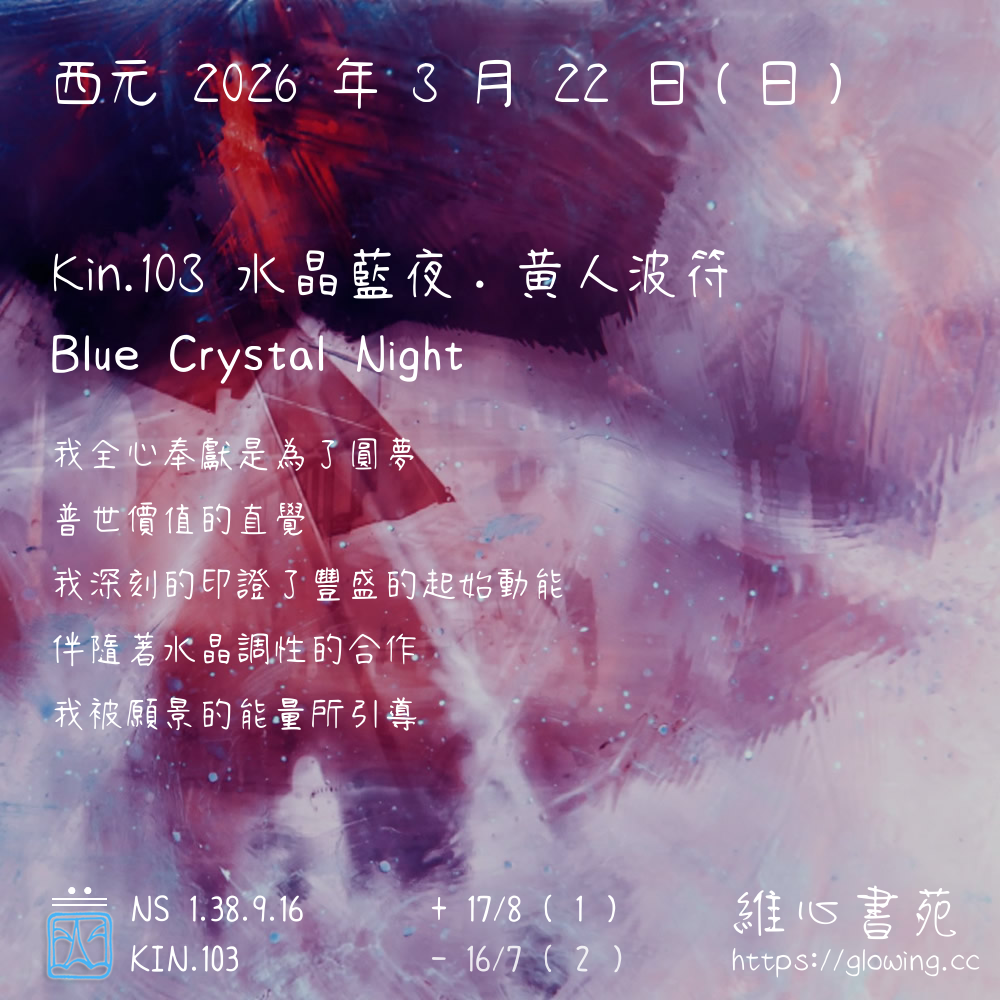 我們可以稱 KIN 103 為 【水晶藍夜】 、 【水晶的藍夜】 、 【黃人波符 之 水晶藍夜】 也可以是 【水晶藍夜.黃人波符】 ,你比較喜歡哪一個稱號呢?