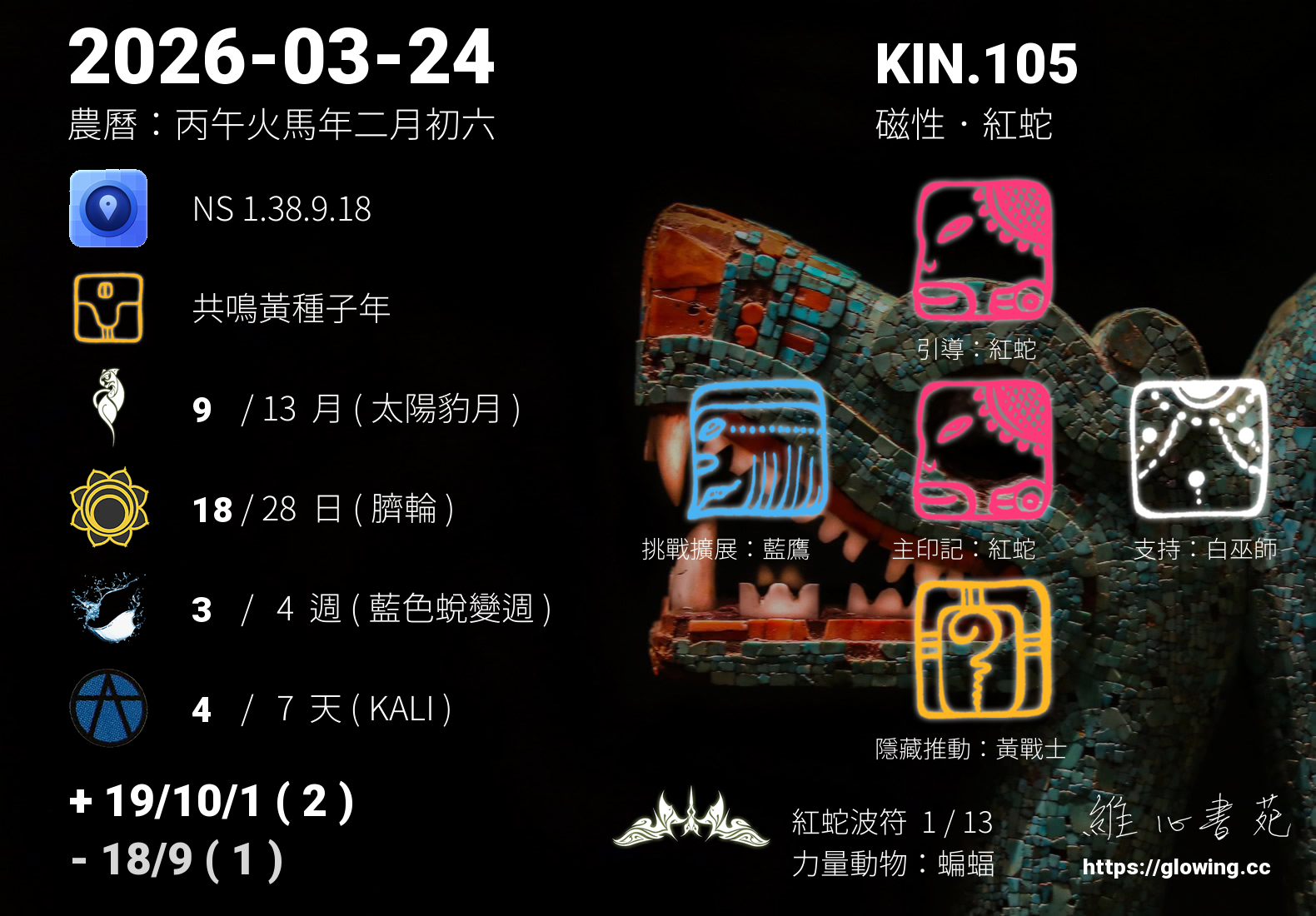 紅蛇作為20個波符中的第九個,讓我們能透過更宏觀的視角去體會,何為存在?沒有雙腳的蛇是如何在這個現實世界中生存的,我們可以試想,這個肉身的覺知是否有著更高智慧的連結,蛇之所以能行走站立,並非依靠軟骨等其他相關科學論述,而是在於其強大的生命力與土地連結的特殊性,我們不需去恐懼擔憂是否能夠在社會上立足,因為每一個人的存在就是一種祝福,外觀的美醜從來不是宇宙觀照的面向,我們每一個人都受到全然的祝福,能夠感受到全然的愛,生生不息不是表面上字義的理解,而是一種持續運行的常態,對應著天體映照世間。