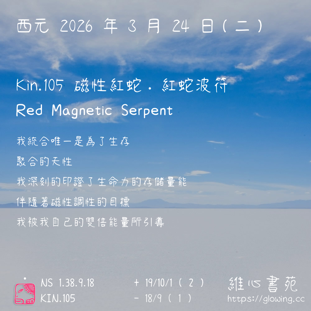 我們可以稱 KIN 105 為 【磁性紅蛇】 、 【磁性的紅蛇】 、 【紅蛇波符 之 磁性紅蛇】 也可以是 【磁性紅蛇.紅蛇波符】 ,你比較喜歡哪一個稱號呢?