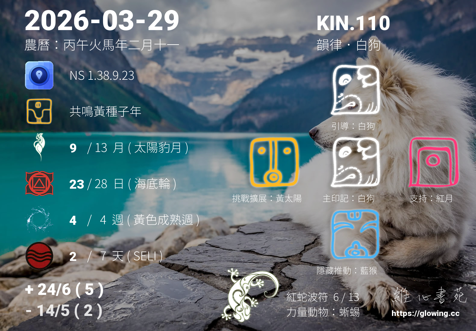 白狗的引導依據KIN的調性不同會有五種可能性,KIN.110的引導圖騰是白狗 , 沒有白狗的引導,我們沒有辦法體會到具象的愛,真實的能量流動,需要伴隨著具象的行為模式,白狗的愛相當的純粹、自然且生動現實,我們可以全然的接受,那發自內心毫無一絲污漬的潔淨純白。