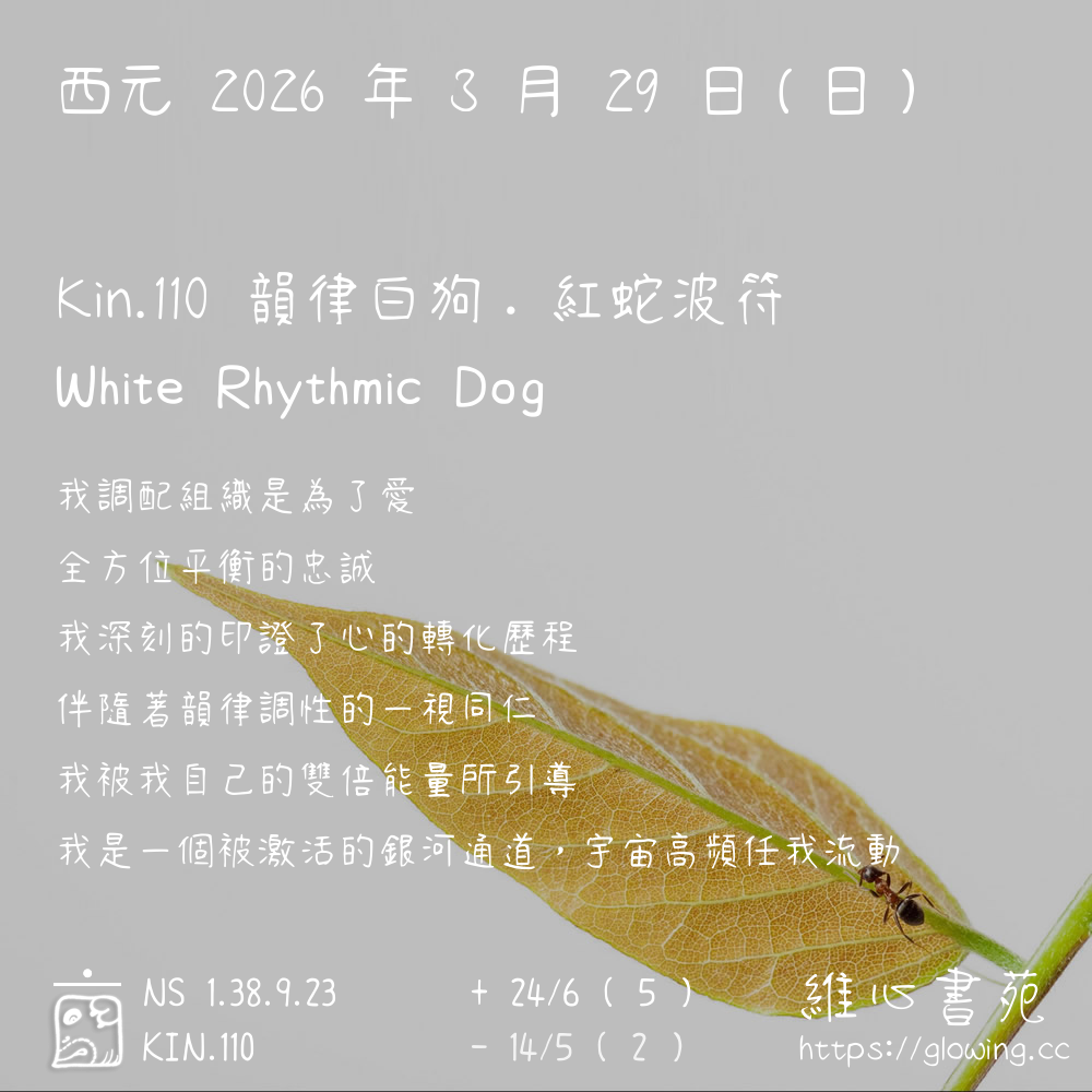 我們可以稱 KIN 110 為 【韻律白狗】 、 【韻律的白狗】 、 【紅蛇波符 之 韻律白狗】 也可以是 【韻律白狗.紅蛇波符】 ,你比較喜歡哪一個稱號呢?