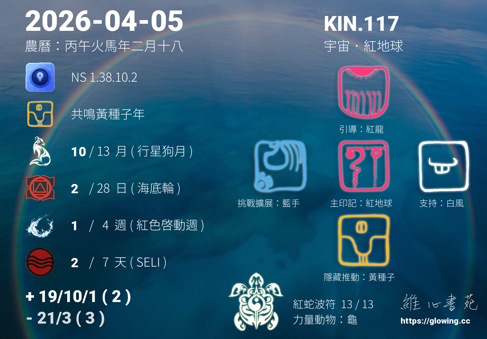 紅地球的引導依據KIN的調性不同會有五種可能性,KIN.117的引導圖騰是紅龍 , 在紅龍的引導下,我們體會了無常的變化並見證了生命的奇蹟,見證了從幻象中突破的勇氣與決心,見證了從虛無到具象的喜悅,見證了從悲傷到豐盛的富足,見證了從無到有的奇蹟