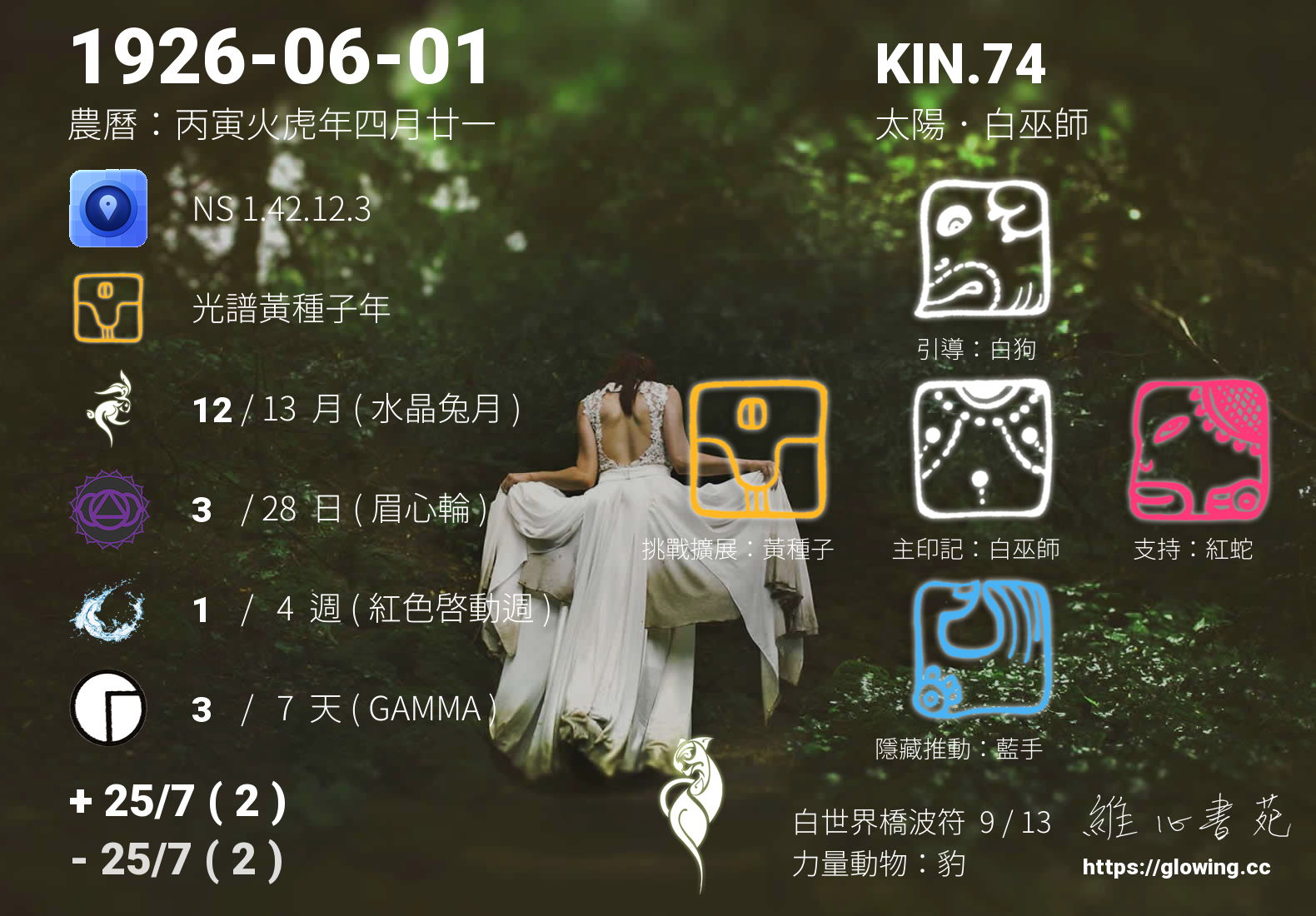 我們可以稱 KIN 74 為 【太陽白巫師】 、 【太陽的白巫師】 、 【白世界橋波符 之 太陽白巫師】 也可以是 【太陽白巫師.白世界橋波符】 ,你比較喜歡哪一個稱號呢?