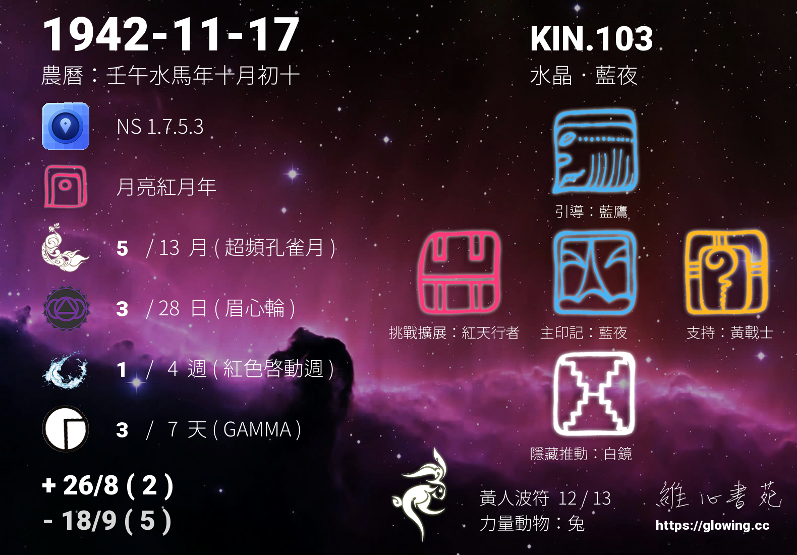 今天的星際原型圖騰為藍夜,我們稱之為主印記, 藍夜是夢想家的原型,有將夢想成真的天賦,直覺力強,在實踐夢想的過程中樂於分享將能更享豐盛。