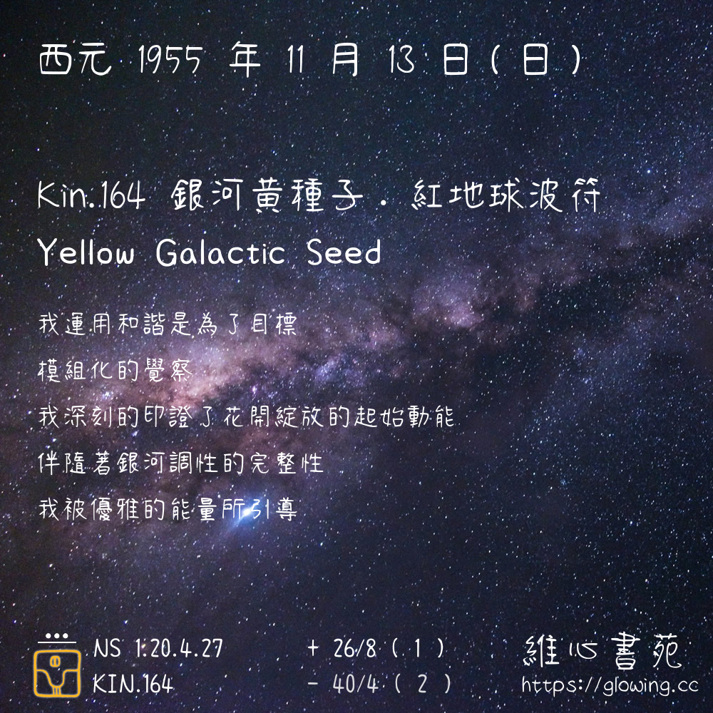 我們可以稱 KIN 164 為 【銀河黃種子】 、 【銀河的黃種子】 、 【紅地球波符 之 銀河黃種子】 也可以是 【銀河黃種子.紅地球波符】 ,你比較喜歡哪一個稱號呢?