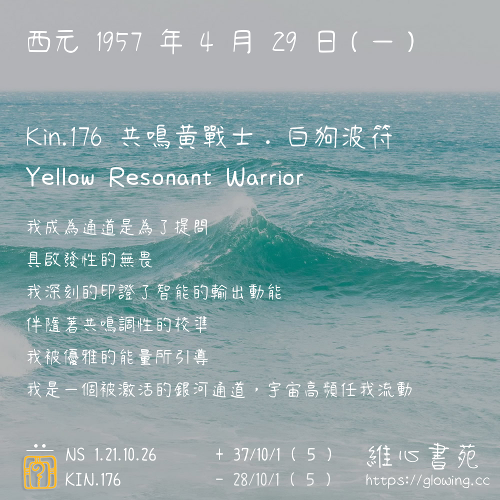 我們可以稱 KIN 176 為 【共鳴黃戰士】 、 【共鳴的黃戰士】 、 【白狗波符 之 共鳴黃戰士】 也可以是 【共鳴黃戰士.白狗波符】 ,你比較喜歡哪一個稱號呢?