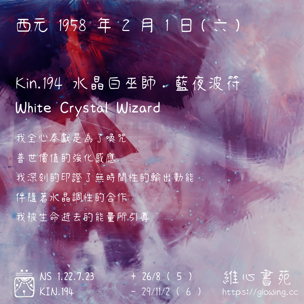 我們可以稱 KIN 194 為 【水晶白巫師】 、 【水晶的白巫師】 、 【藍夜波符 之 水晶白巫師】 也可以是 【水晶白巫師.藍夜波符】 ,你比較喜歡哪一個稱號呢?