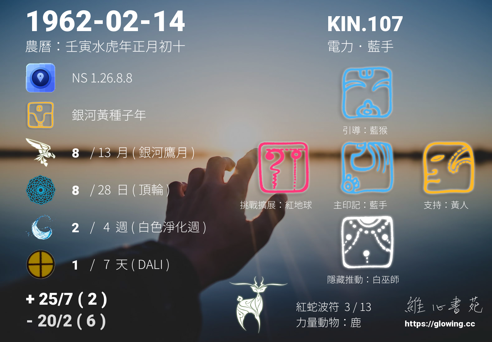 我們可以稱 KIN 107 為 【電力藍手】 、 【電力的藍手】 、 【紅蛇波符 之 電力藍手】 也可以是 【電力藍手.紅蛇波符】 ,你比較喜歡哪一個稱號呢?