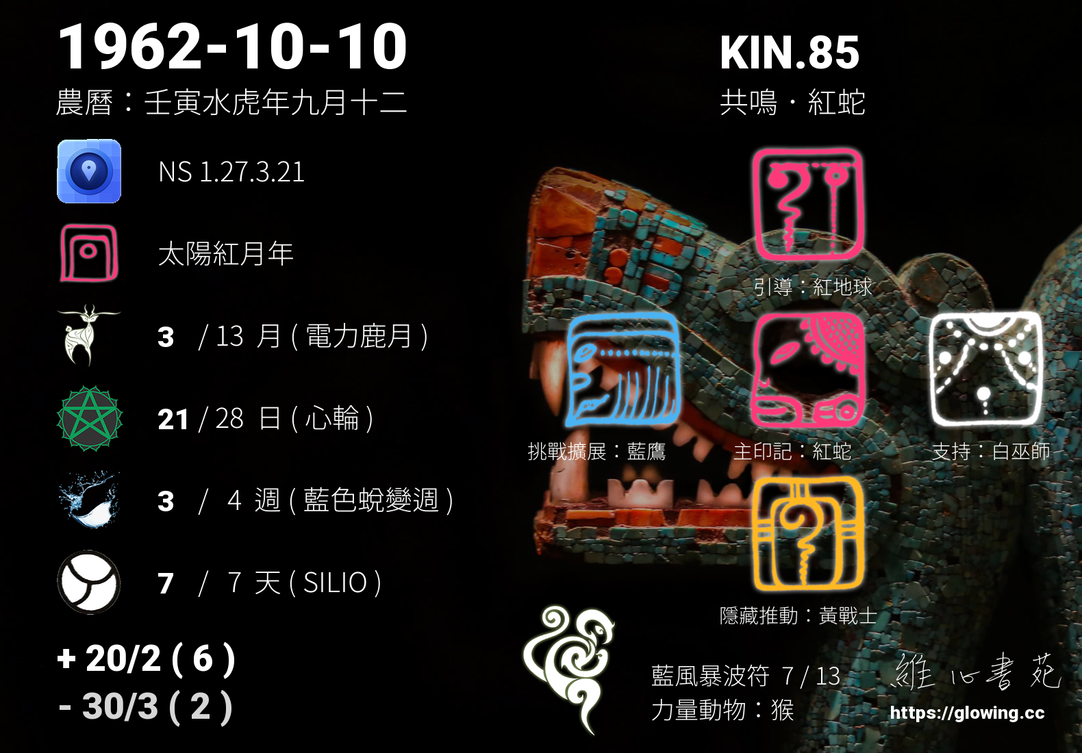 我們可以稱 KIN 85 為 【共鳴紅蛇】 、 【共鳴的紅蛇】 、 【藍風暴波符 之 共鳴紅蛇】 也可以是 【共鳴紅蛇.藍風暴波符】 ,你比較喜歡哪一個稱號呢?