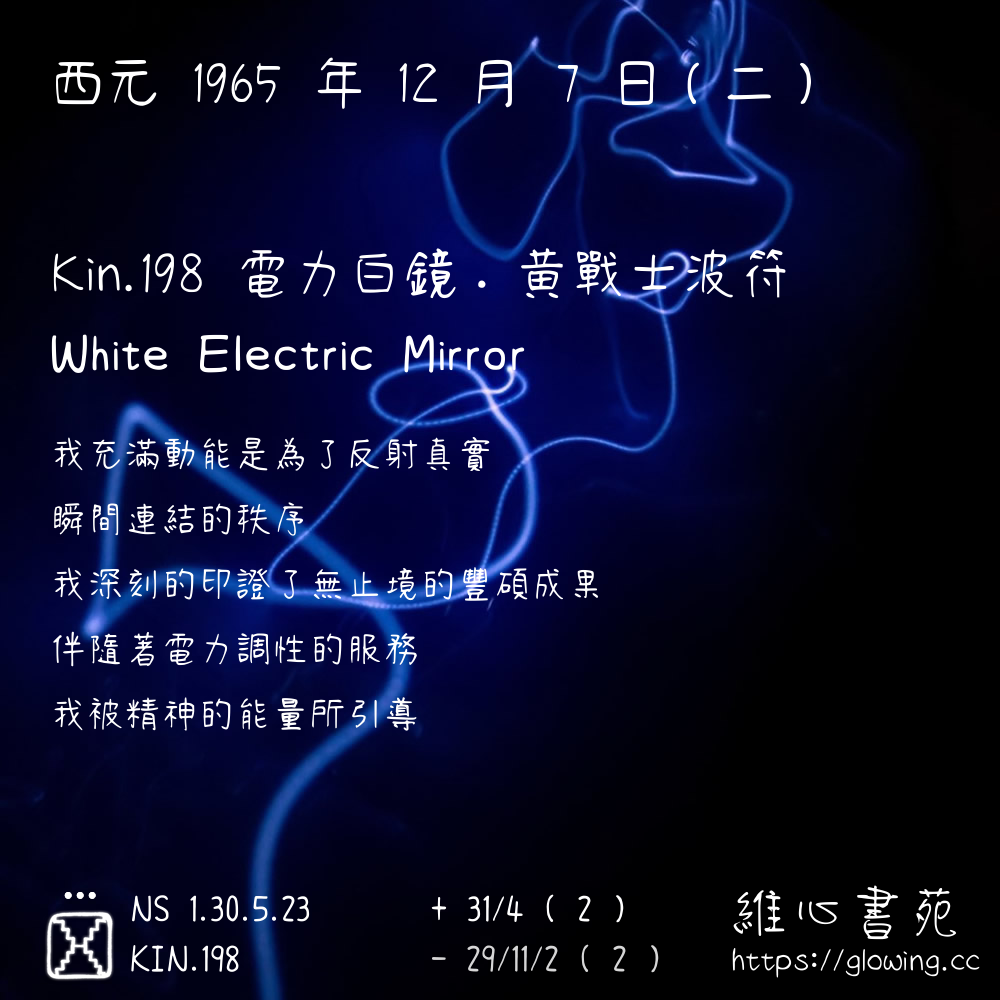 我們可以稱 KIN 198 為 【電力白鏡】 、 【電力的白鏡】 、 【黃戰士波符 之 電力白鏡】 也可以是 【電力白鏡.黃戰士波符】 ,你比較喜歡哪一個稱號呢?