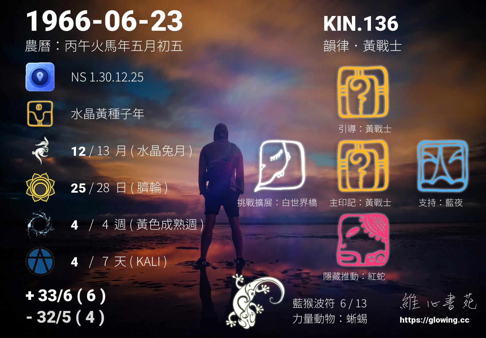 黃戰士的引導依據KIN的調性不同會有五種可能性,KIN.136的引導圖騰是黃戰士 , 黃戰士引導著我們勇敢無懼地去實現夢想,所有的夢想都需要時間去成就,在一步步的突破中我們需要無比的勇氣,黃戰士的無畏提供我們滋糧,讓我們堅實挺立不畏風霜,終將取得豐碩的成果。