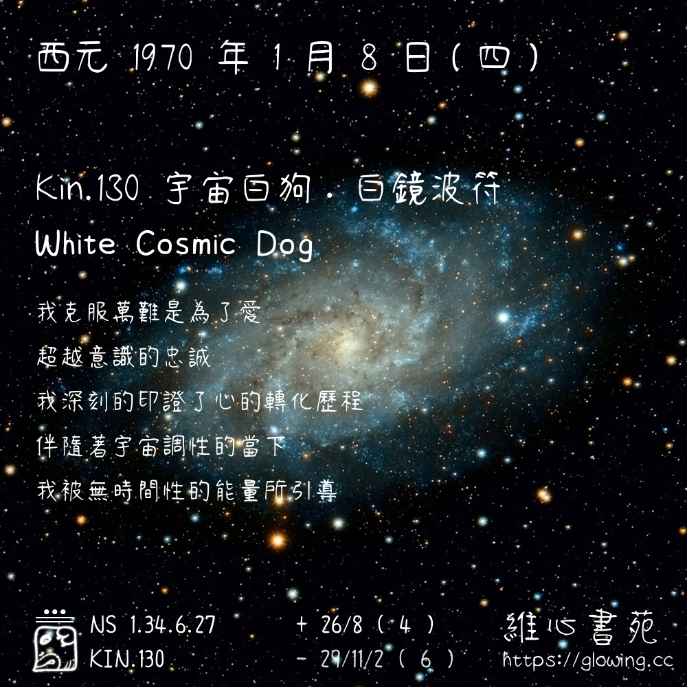 我們可以稱 KIN 130 為 【宇宙白狗】 、 【宇宙的白狗】 、 【白鏡波符 之 宇宙白狗】 也可以是 【宇宙白狗.白鏡波符】 ,你比較喜歡哪一個稱號呢?