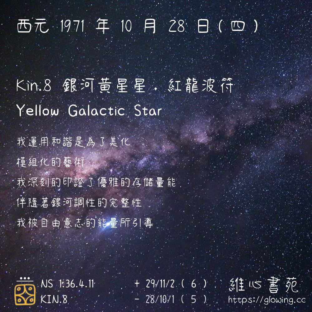 我們可以稱 KIN 8 為 【銀河黃星星】 、 【銀河的黃星星】 、 【紅龍波符 之 銀河黃星星】 也可以是 【銀河黃星星.紅龍波符】 ,你比較喜歡哪一個稱號呢?