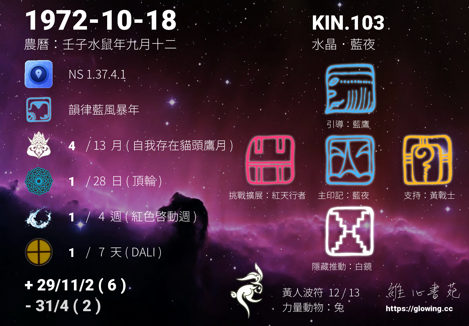 今天的星際原型圖騰為藍夜,我們稱之為主印記, 藍夜是夢想家的原型,有將夢想成真的天賦,直覺力強,在實踐夢想的過程中樂於分享將能更享豐盛。
