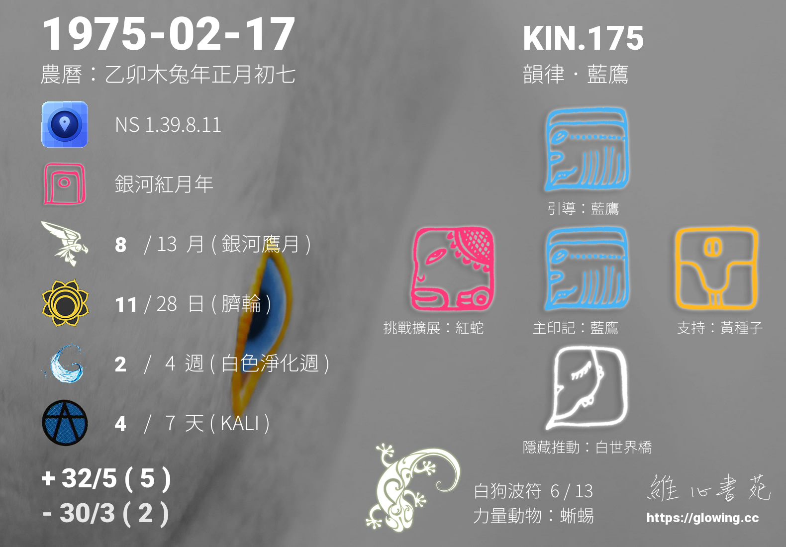 我們可以稱 KIN 175 為 【韻律藍鷹】 、 【韻律的藍鷹】 、 【白狗波符 之 韻律藍鷹】 也可以是 【韻律藍鷹.白狗波符】 ,你比較喜歡哪一個稱號呢?
