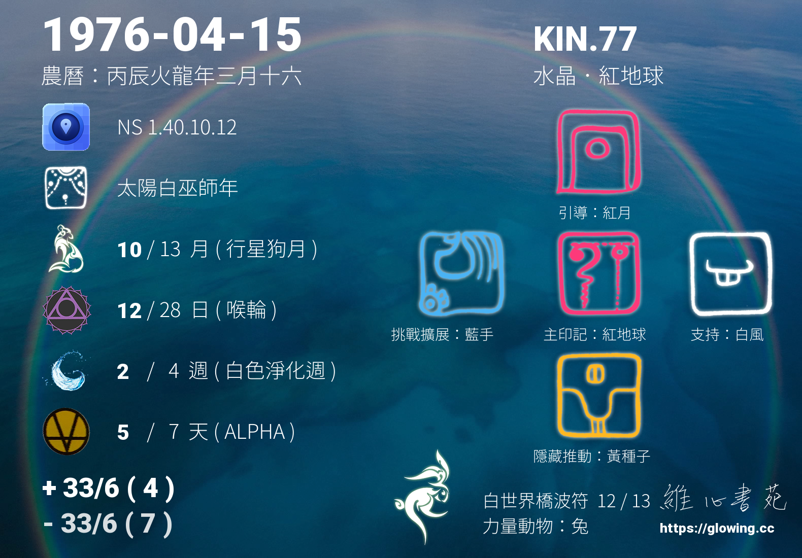 我們可以稱 KIN 77 為 【水晶紅地球】 、 【水晶的紅地球】 、 【白世界橋波符 之 水晶紅地球】 也可以是 【水晶紅地球.白世界橋波符】 ,你比較喜歡哪一個稱號呢?