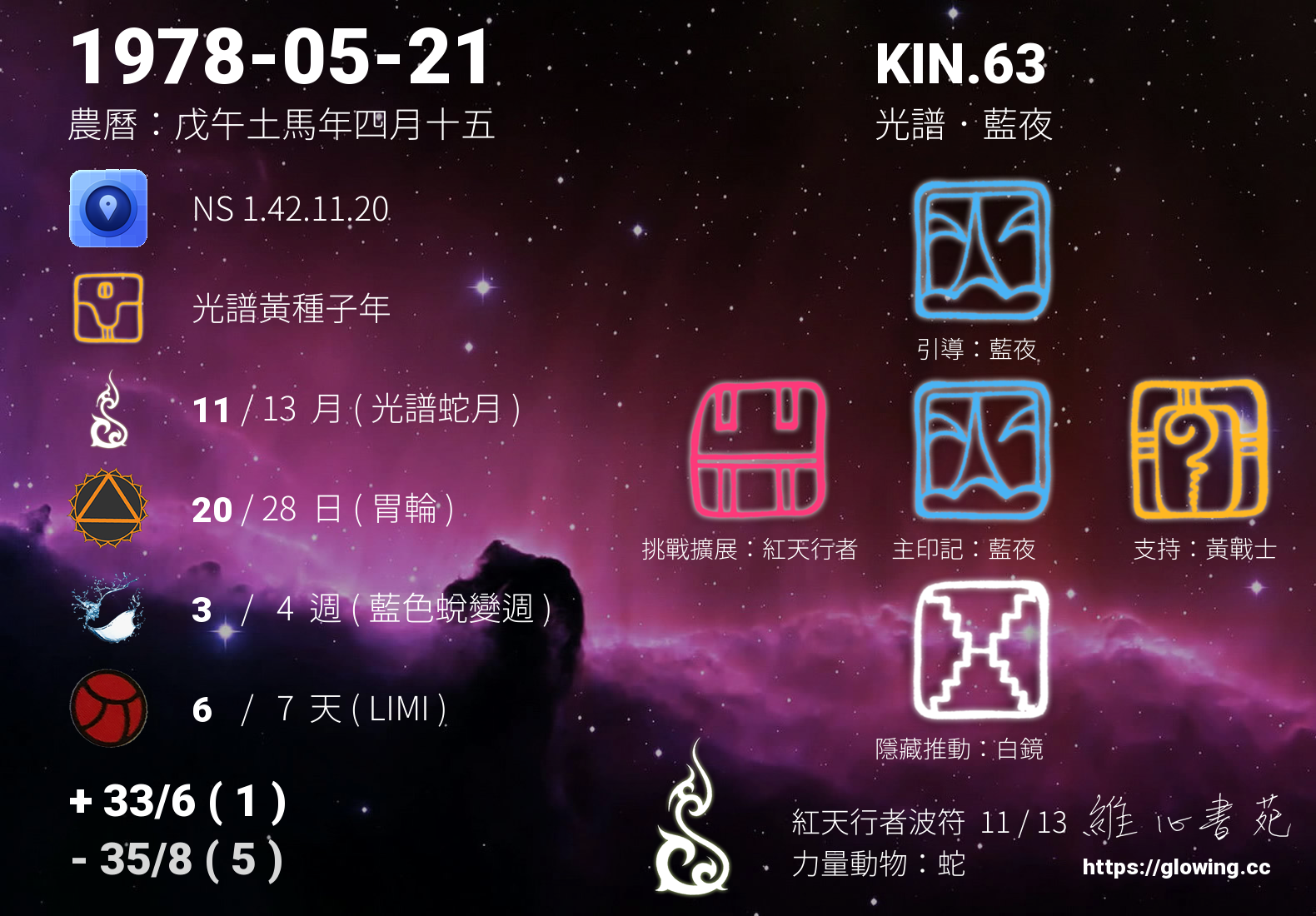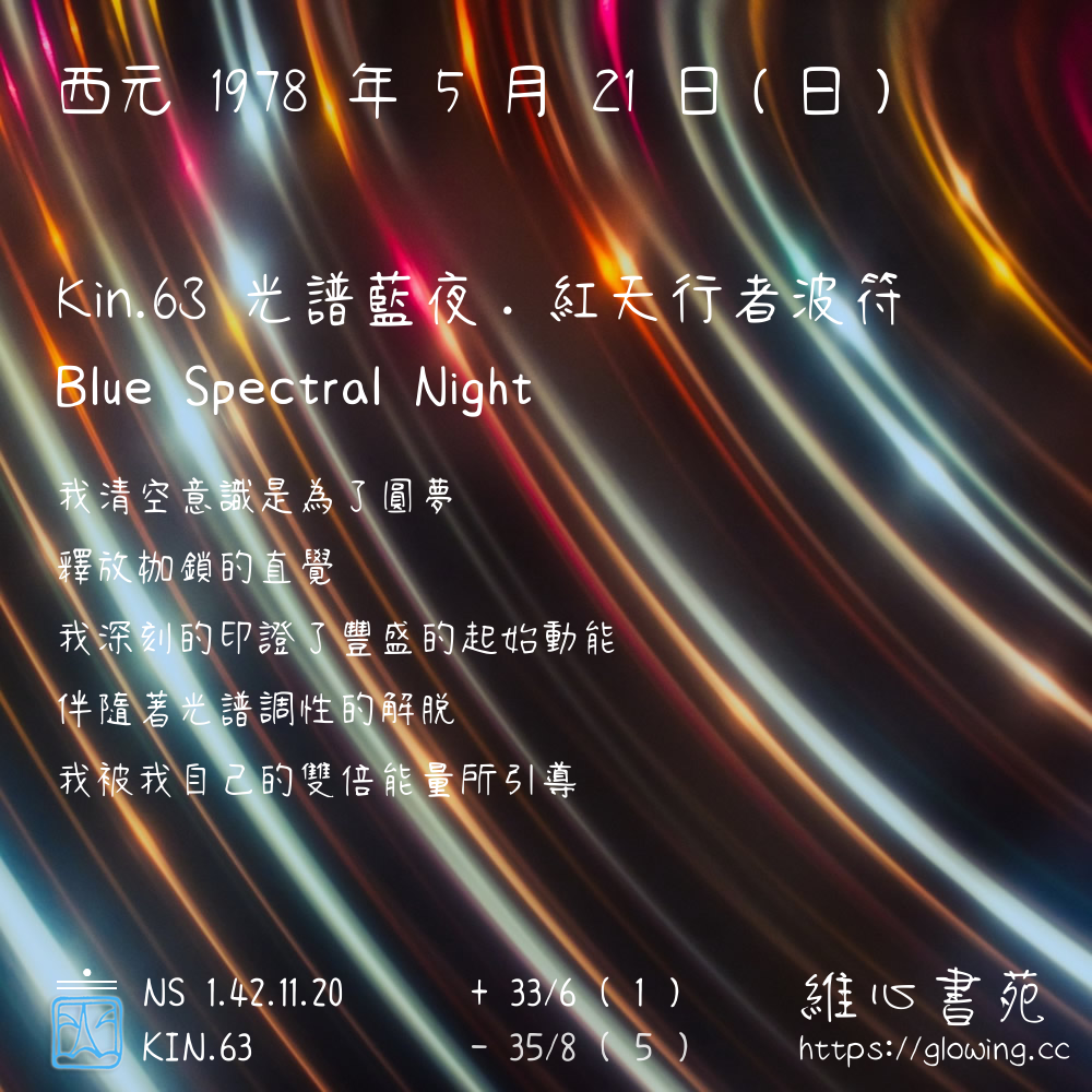 我們可以稱 KIN 63 為 【光譜藍夜】 、 【光譜的藍夜】 、 【紅天行者波符 之 光譜藍夜】 也可以是 【光譜藍夜.紅天行者波符】 ,你比較喜歡哪一個稱號呢?