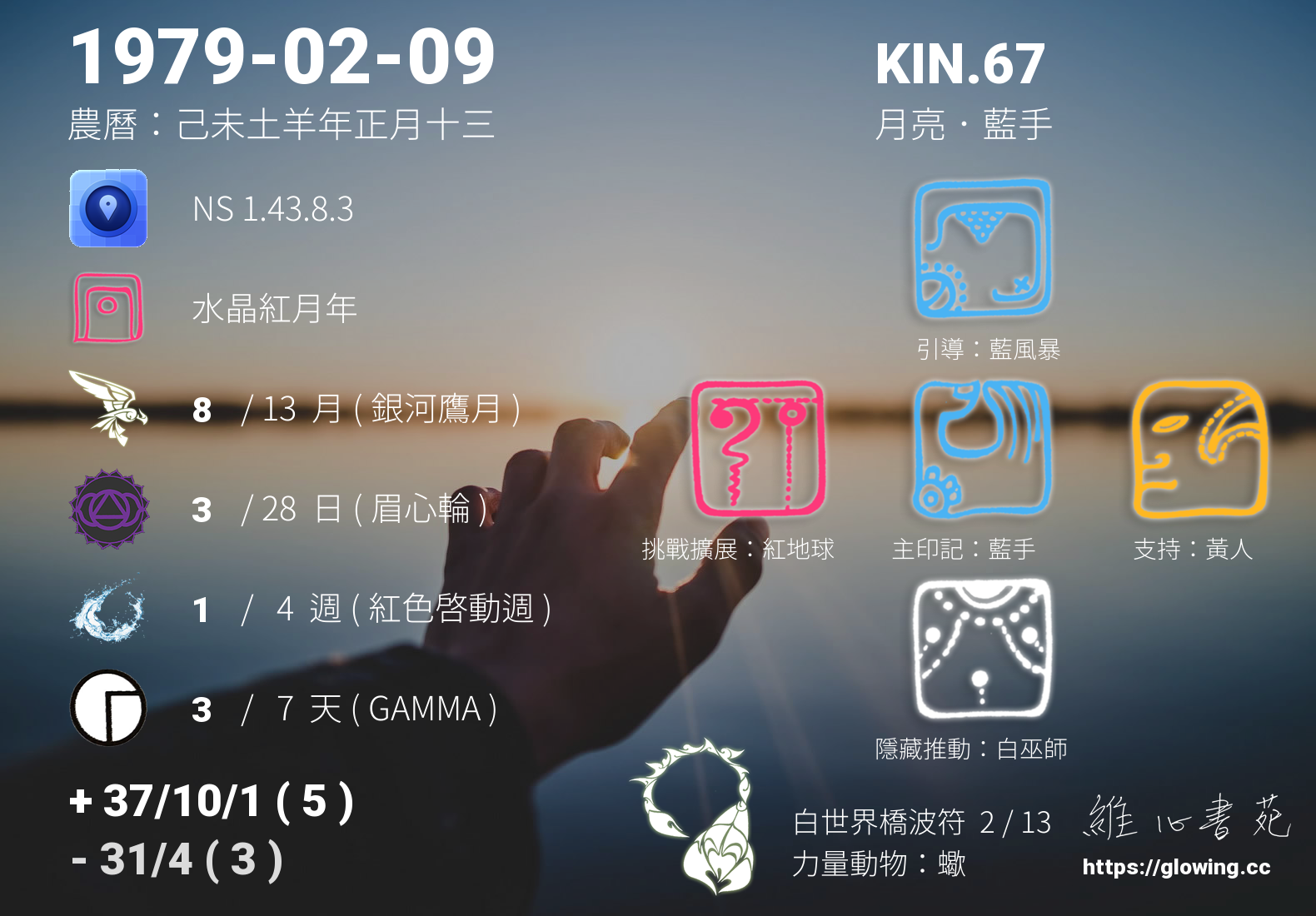 我們可以稱 KIN 67 為 【月亮藍手】 、 【月亮的藍手】 、 【白世界橋波符 之 月亮藍手】 也可以是 【月亮藍手.白世界橋波符】 ,你比較喜歡哪一個稱號呢?