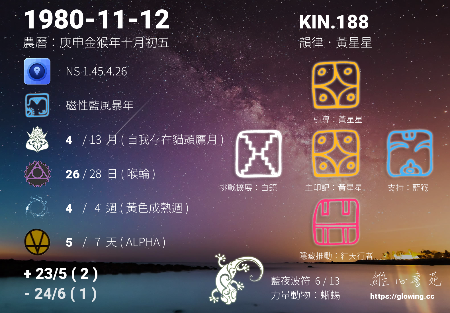 KIN.188 位於 藍夜波符 13 天中的第 6 天,銀河音階為調性 6