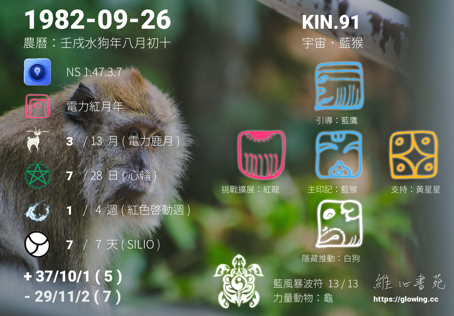 我們可以稱 KIN 91 為 【宇宙藍猴】 、 【宇宙的藍猴】 、 【藍風暴波符 之 宇宙藍猴】 也可以是 【宇宙藍猴.藍風暴波符】 ,你比較喜歡哪一個稱號呢?