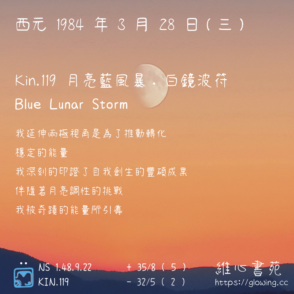 我們可以稱 KIN 119 為 【月亮藍風暴】 、 【月亮的藍風暴】 、 【白鏡波符 之 月亮藍風暴】 也可以是 【月亮藍風暴.白鏡波符】 ,你比較喜歡哪一個稱號呢?