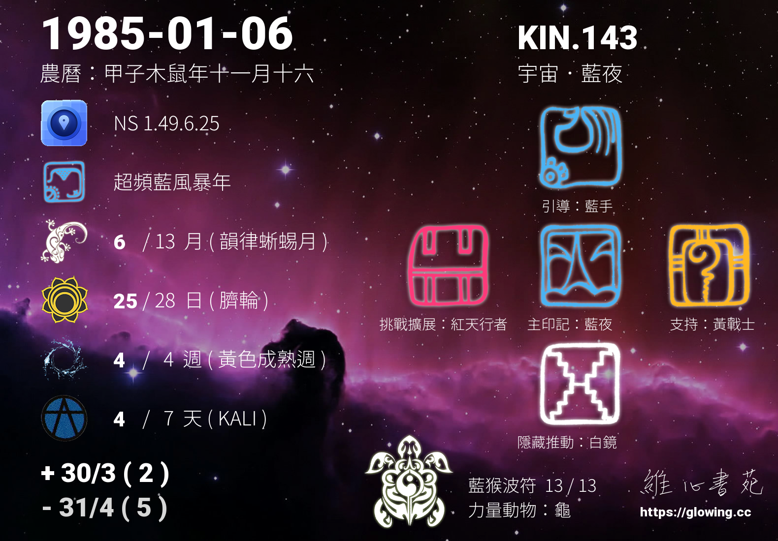 我們可以稱 KIN 143 為 【宇宙藍夜】 、 【宇宙的藍夜】 、 【藍猴波符 之 宇宙藍夜】 也可以是 【宇宙藍夜.藍猴波符】 ,你比較喜歡哪一個稱號呢?