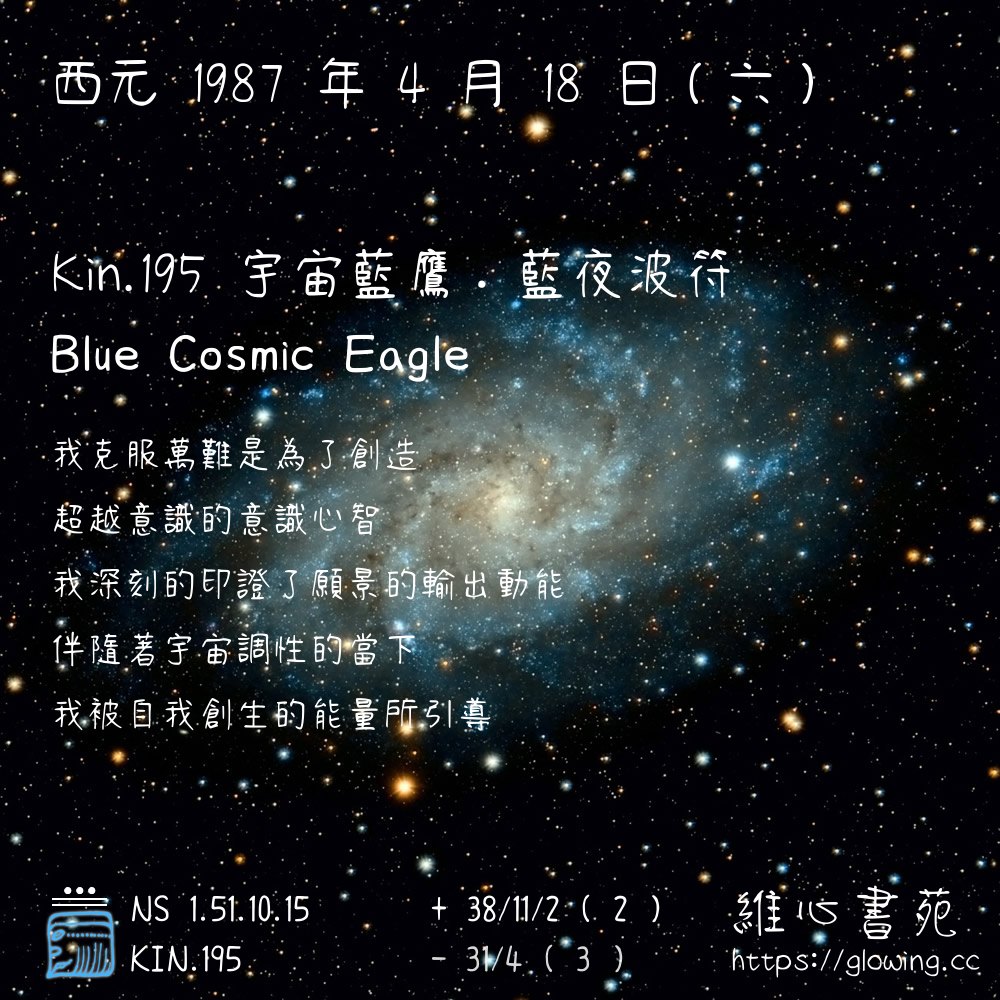 我們可以稱 KIN 195 為 【宇宙藍鷹】 、 【宇宙的藍鷹】 、 【藍夜波符 之 宇宙藍鷹】 也可以是 【宇宙藍鷹.藍夜波符】 ,你比較喜歡哪一個稱號呢?