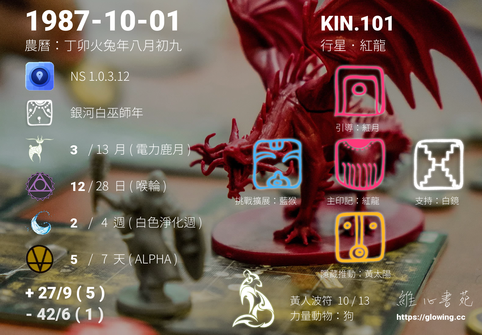今天的星際原型圖騰為紅龍,我們稱之為主印記, 紅龍是卓爾金曆的第一個圖騰,代表著生命的起源與創造,跟家庭的緣分深刻,動能豐沛。