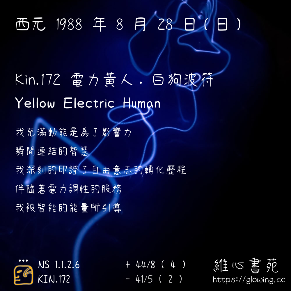 我們可以稱 KIN 172 為 【電力黃人】 、 【電力的黃人】 、 【白狗波符 之 電力黃人】 也可以是 【電力黃人.白狗波符】 ,你比較喜歡哪一個稱號呢?