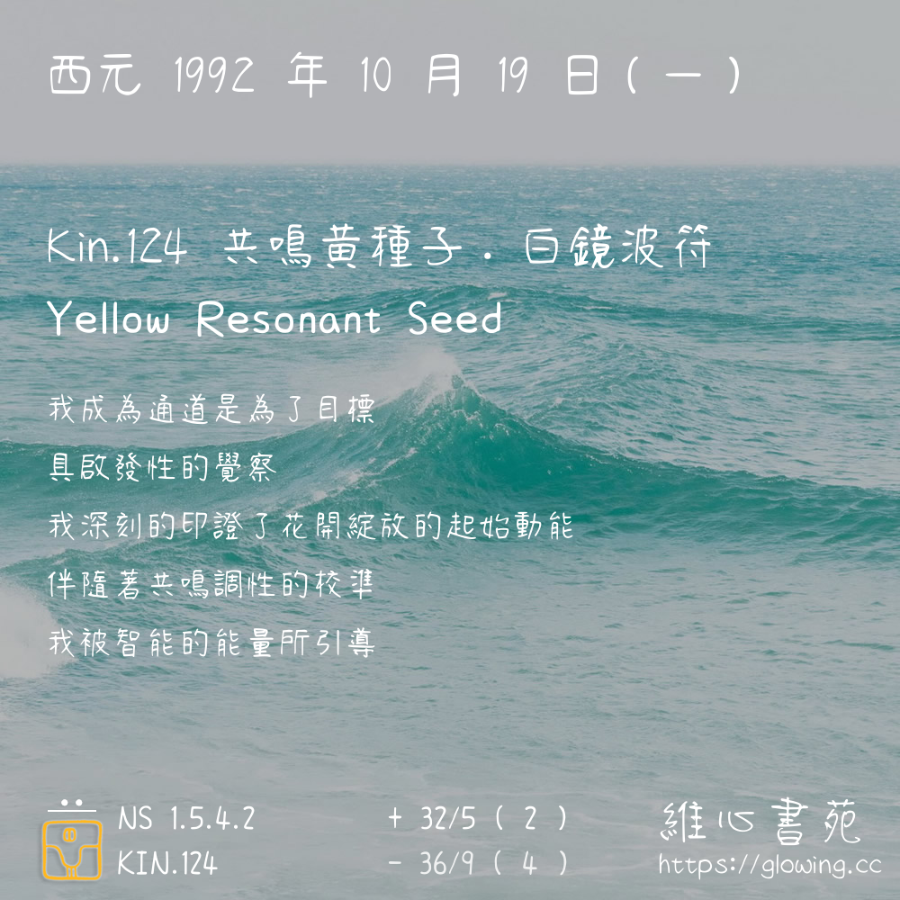 我們可以稱 KIN 124 為 【共鳴黃種子】 、 【共鳴的黃種子】 、 【白鏡波符 之 共鳴黃種子】 也可以是 【共鳴黃種子.白鏡波符】 ,你比較喜歡哪一個稱號呢?