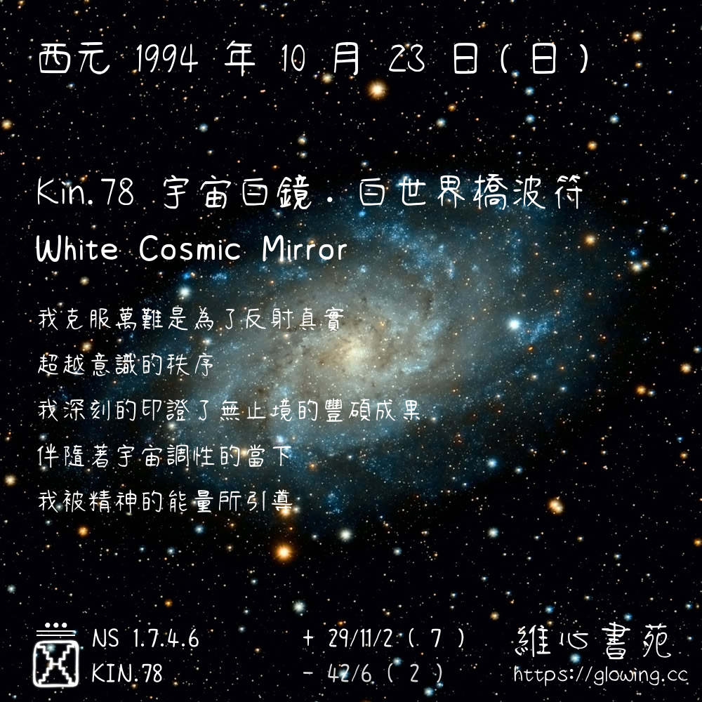 我們可以稱 KIN 78 為 【宇宙白鏡】 、 【宇宙的白鏡】 、 【白世界橋波符 之 宇宙白鏡】 也可以是 【宇宙白鏡.白世界橋波符】 ,你比較喜歡哪一個稱號呢?