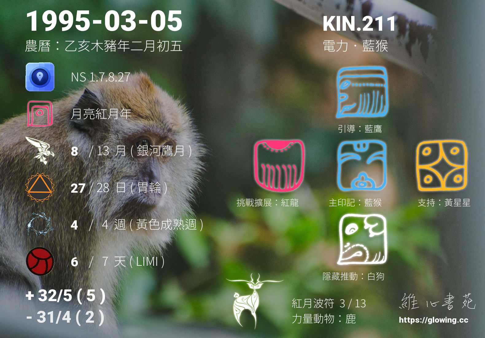 我們可以稱 KIN 211 為 【電力藍猴】 、 【電力的藍猴】 、 【紅月波符 之 電力藍猴】 也可以是 【電力藍猴.紅月波符】 ,你比較喜歡哪一個稱號呢?