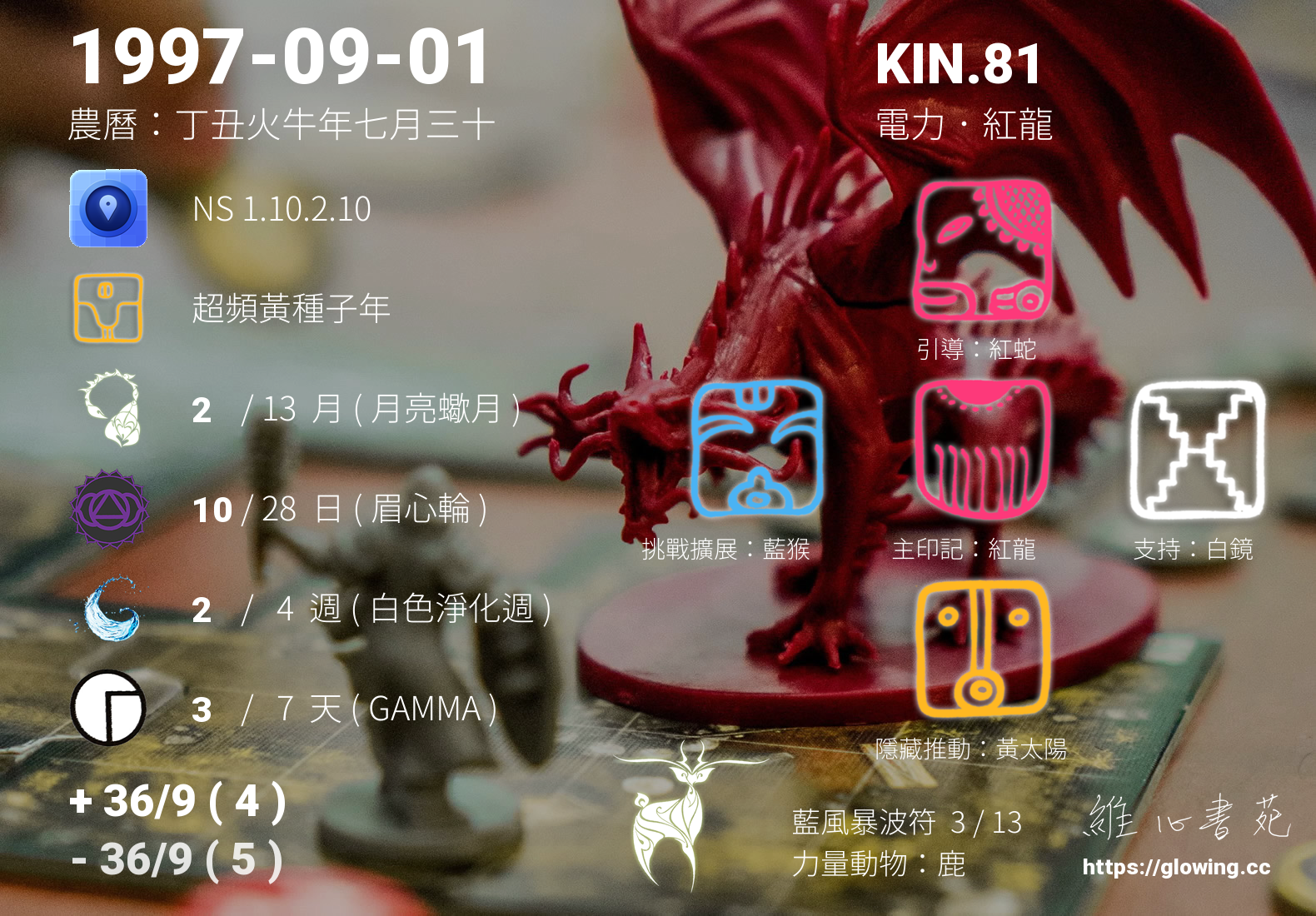 今天的星際原型圖騰為紅龍,我們稱之為主印記, 紅龍是卓爾金曆的第一個圖騰,代表著生命的起源與創造,跟家庭的緣分深刻,動能豐沛。