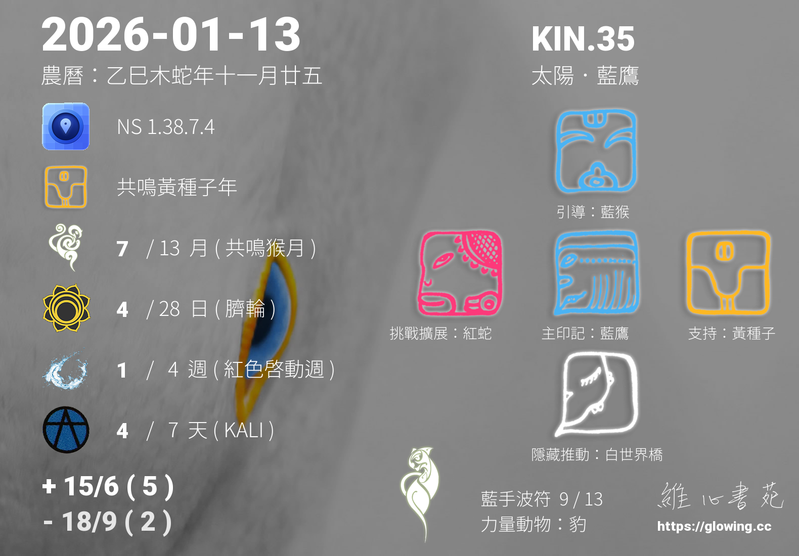 我們可以稱 KIN 35 為 【太陽藍鷹】 、 【太陽的藍鷹】 、 【藍手波符 之 太陽藍鷹】 也可以是 【太陽藍鷹.藍手波符】 ,你比較喜歡哪一個稱號呢?