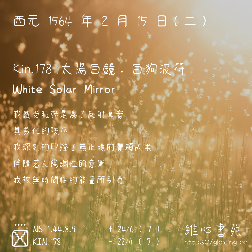 我們可以稱 KIN 178 為 【太陽白鏡】 、 【太陽的白鏡】 、 【白狗波符 之 太陽白鏡】 也可以是 【太陽白鏡.白狗波符】 ,你比較喜歡哪一個稱號呢?