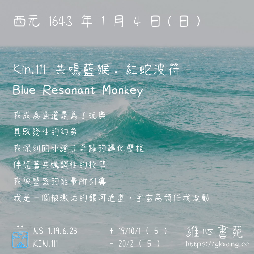 我們可以稱 KIN 111 為 【共鳴藍猴】 、 【共鳴的藍猴】 、 【紅蛇波符 之 共鳴藍猴】 也可以是 【共鳴藍猴.紅蛇波符】 ,你比較喜歡哪一個稱號呢?