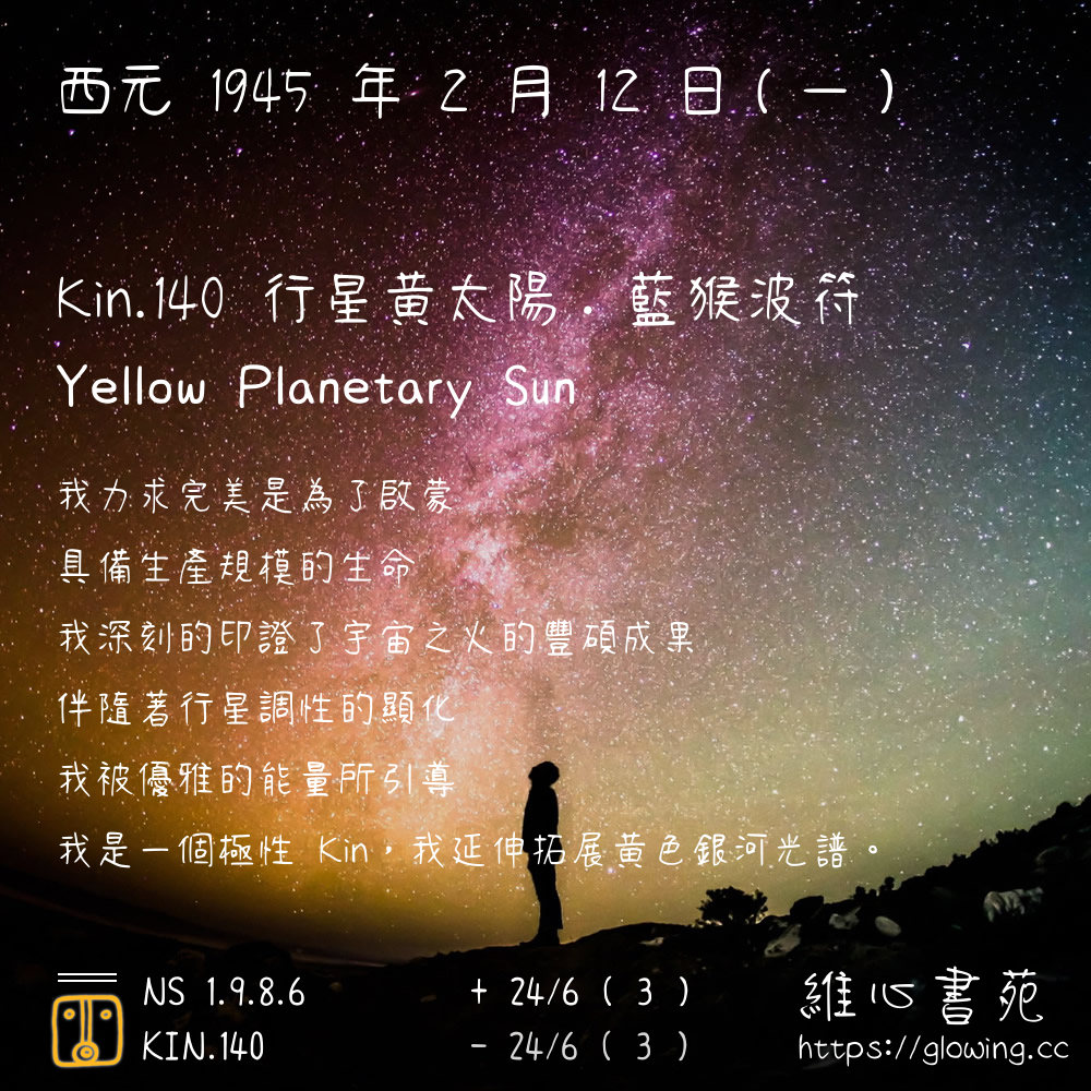 我們可以稱 KIN 140 為 【行星黃太陽】 、 【行星的黃太陽】 、 【藍猴波符 之 行星黃太陽】 也可以是 【行星黃太陽.藍猴波符】 ,你比較喜歡哪一個稱號呢?