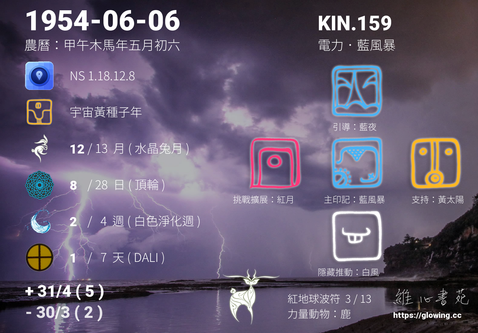我們可以稱 KIN 159 為 【電力藍風暴】 、 【電力的藍風暴】 、 【紅地球波符 之 電力藍風暴】 也可以是 【電力藍風暴.紅地球波符】 ,你比較喜歡哪一個稱號呢?