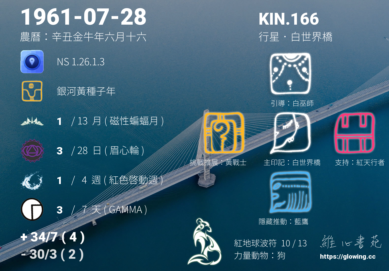 今天的星際原型圖騰為白世界橋,我們稱之為主印記, 白世界橋的重心在於平衡,擅長橋接不同領域的族群或個人,跨越對死亡的執著或恐懼,將可更自在瀟灑的看待世界。