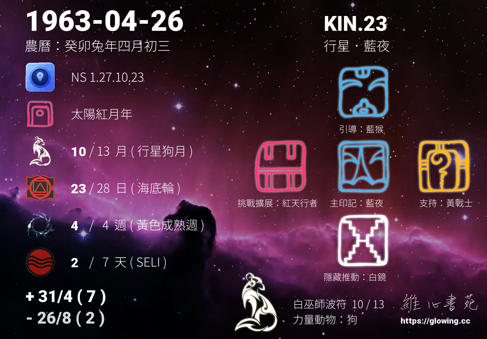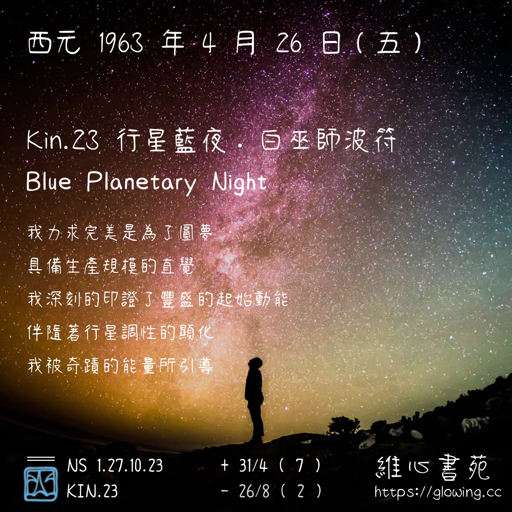 我們可以稱 KIN 23 為 【行星藍夜】 、 【行星的藍夜】 、 【白巫師波符 之 行星藍夜】 也可以是 【行星藍夜.白巫師波符】 ,你比較喜歡哪一個稱號呢?