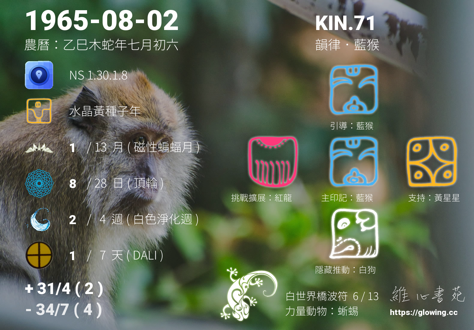 我們可以稱 KIN 71 為 【韻律藍猴】 、 【韻律的藍猴】 、 【白世界橋波符 之 韻律藍猴】 也可以是 【韻律藍猴.白世界橋波符】 ,你比較喜歡哪一個稱號呢?