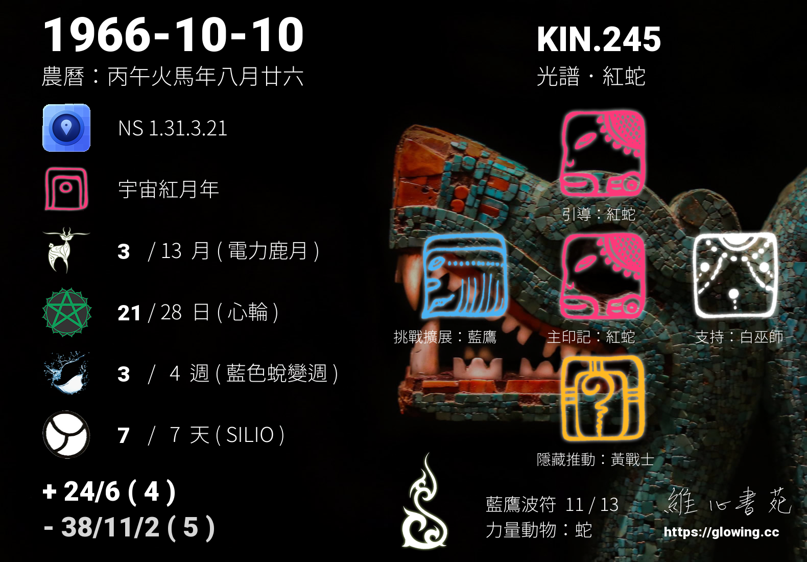 我們可以稱 KIN 245 為 【光譜紅蛇】 、 【光譜的紅蛇】 、 【藍鷹波符 之 光譜紅蛇】 也可以是 【光譜紅蛇.藍鷹波符】 ,你比較喜歡哪一個稱號呢?