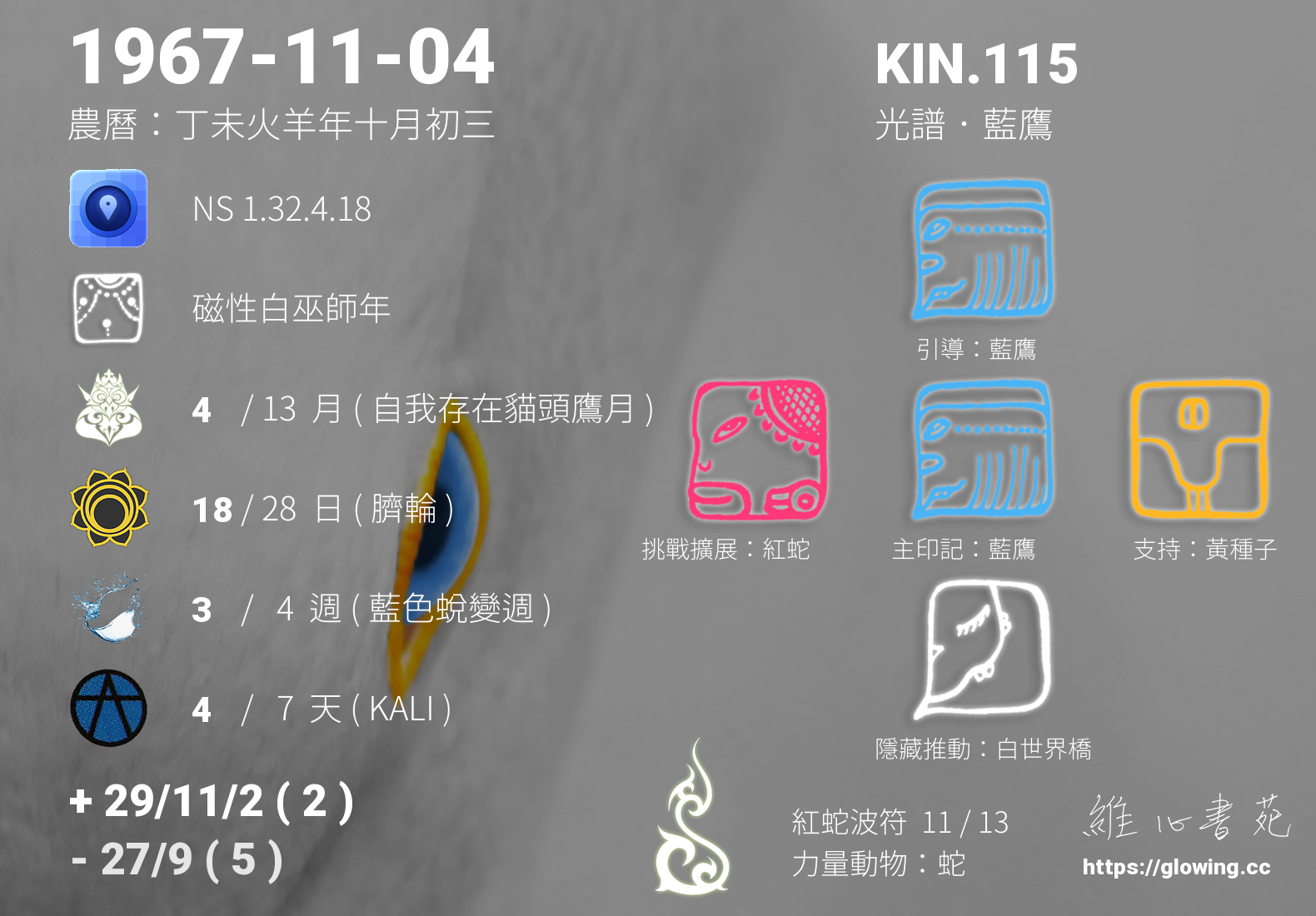 我們可以稱 KIN 115 為 【光譜藍鷹】 、 【光譜的藍鷹】 、 【紅蛇波符 之 光譜藍鷹】 也可以是 【光譜藍鷹.紅蛇波符】 ,你比較喜歡哪一個稱號呢?