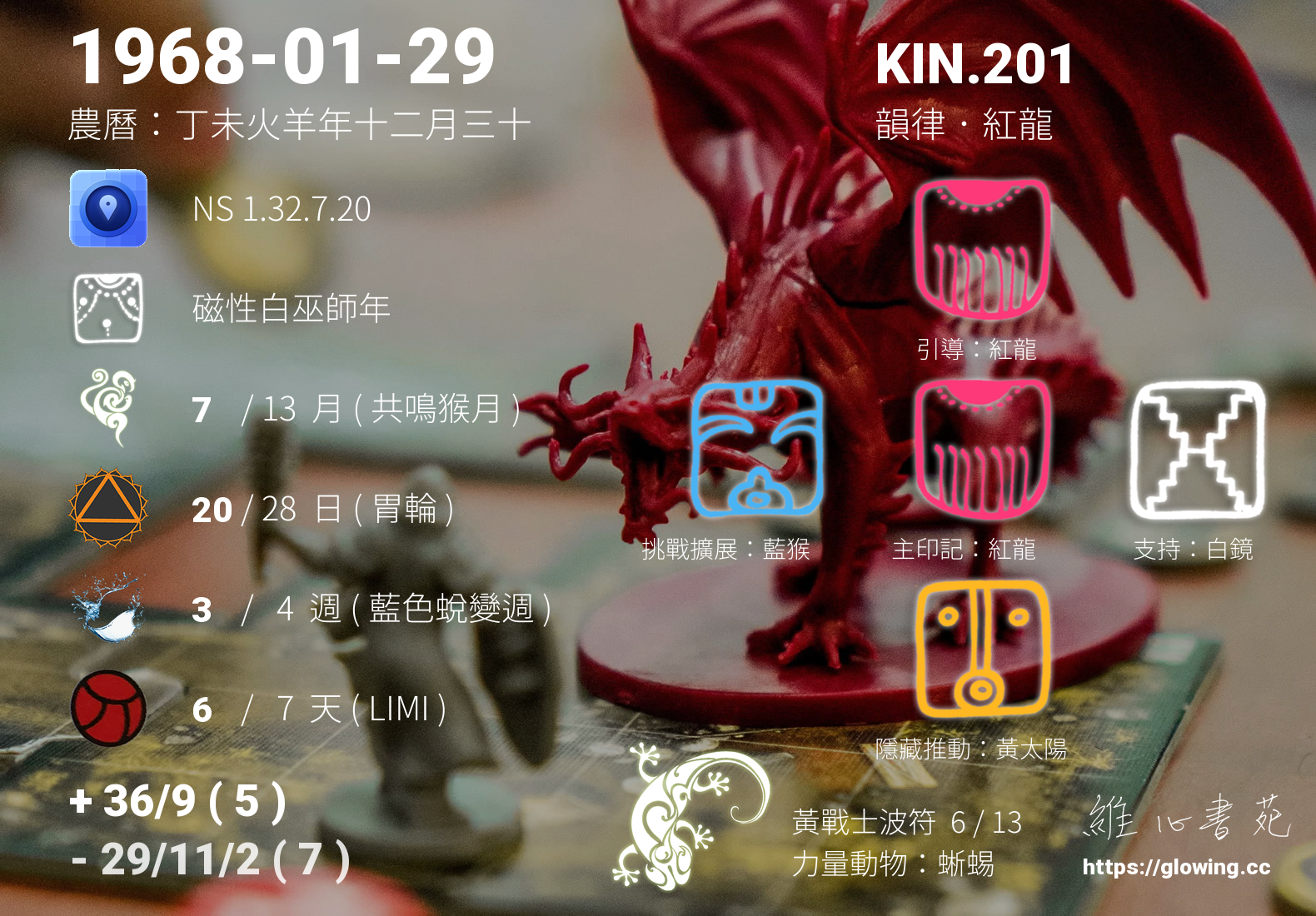 我們可以稱 KIN 201 為 【韻律紅龍】 、 【韻律的紅龍】 、 【黃戰士波符 之 韻律紅龍】 也可以是 【韻律紅龍.黃戰士波符】 ,你比較喜歡哪一個稱號呢?