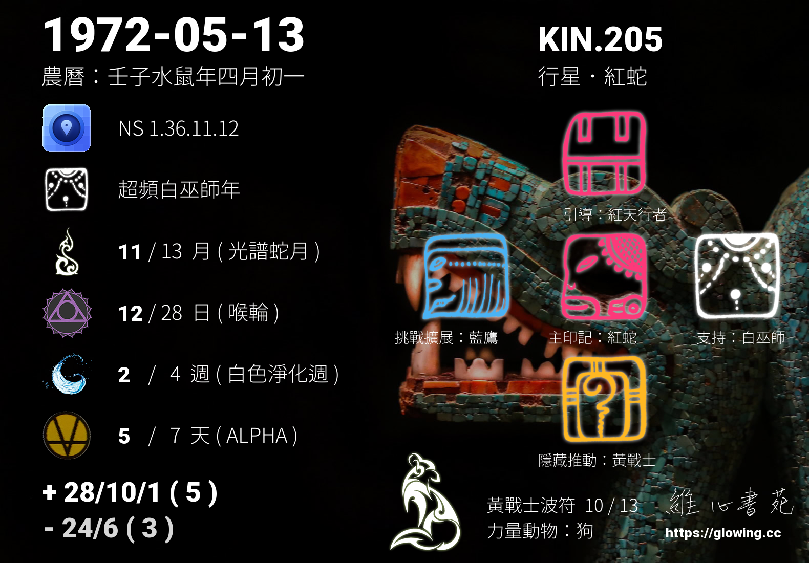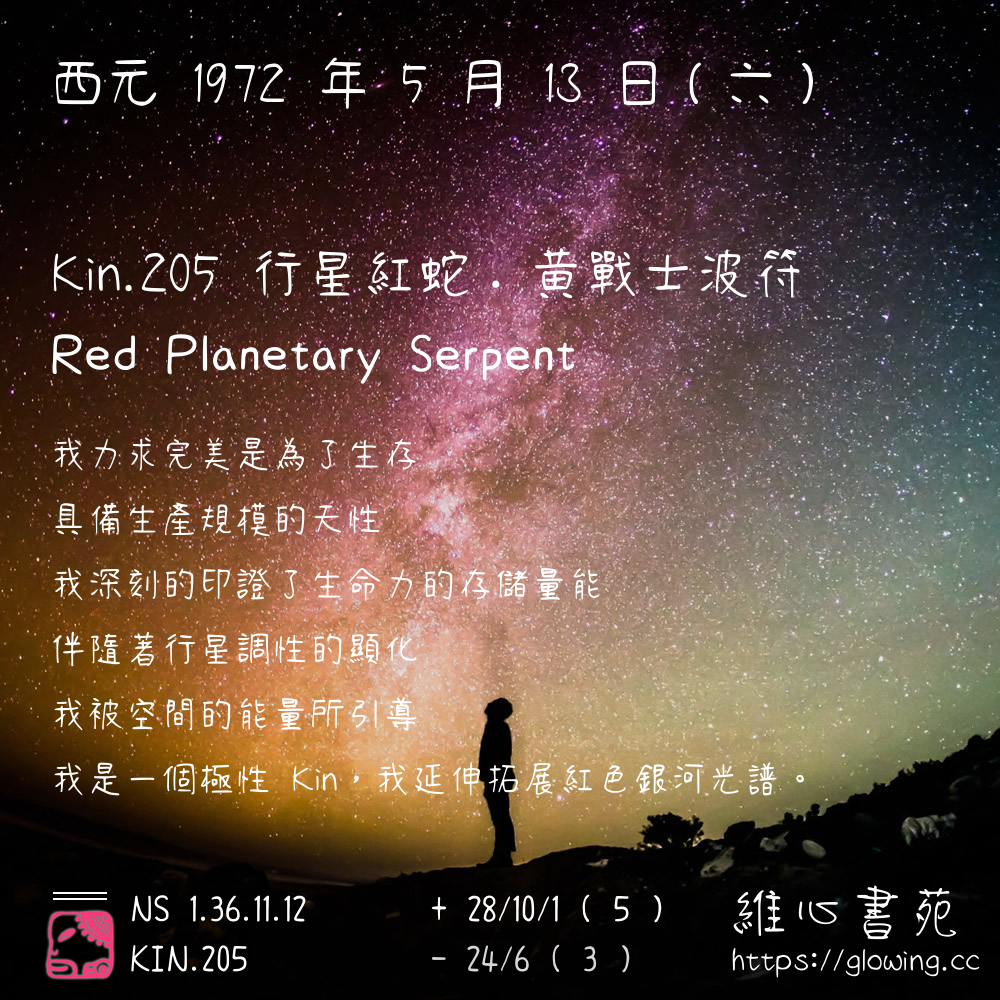 我們可以稱 KIN 205 為 【行星紅蛇】 、 【行星的紅蛇】 、 【黃戰士波符 之 行星紅蛇】 也可以是 【行星紅蛇.黃戰士波符】 ,你比較喜歡哪一個稱號呢?