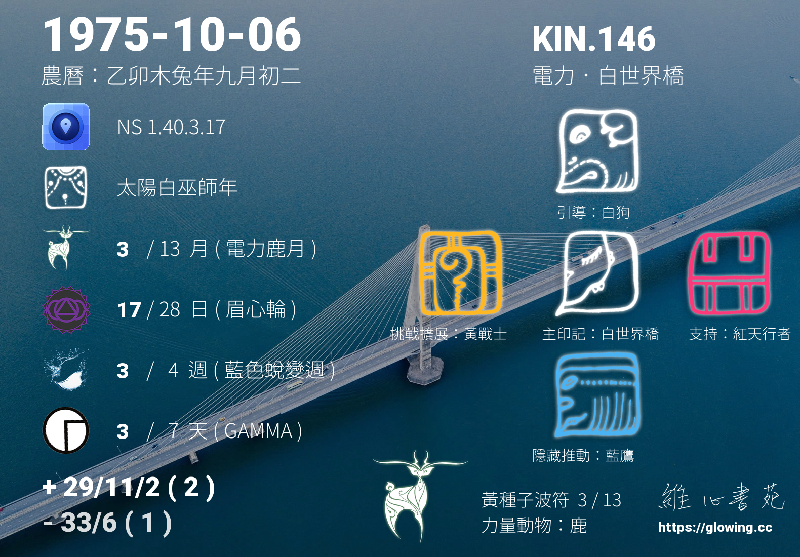 白世界橋的引導依據KIN的調性不同會有五種可能性,KIN.146的引導圖騰是白狗 , 沒有白狗的引導,我們沒有辦法體會到具象的愛,真實的能量流動,需要伴隨著具象的行為模式,白狗的愛相當的純粹、自然且生動現實,我們可以全然的接受,那發自內心毫無一絲污漬的潔淨純白。